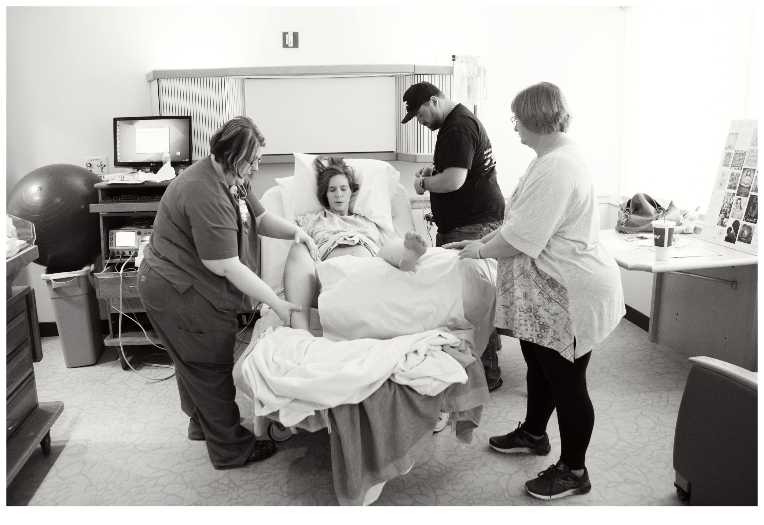 I told her I really felt like I should be pushing. I was leaned over the back of the bed and could really feel my body pressuring me to push. I waited through a few more contractions before moving — she checked again. Almost Complete. The doctor was called in to assess and assist. The baby cart was wheeled over and the lights turned on. The doctor checked me and said she was going to assist in getting me fully dilated during my next contraction. I’d been here before. She did this with Evelyn. I was prepared and comfortable knowing what was happening next. She was gowning up when I felt another one coming. ‘She’s missed her window,’ I thought to myself.