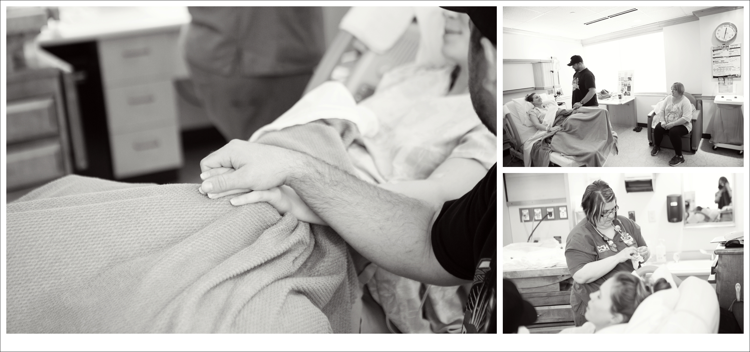 Admittedly, my nerves started around the same time. ‘Will I be able to do this? Well, there’s no turning back now. Would I be able to have this baby without pain medication also? Could I take it? Will my baby be healthy?’ My mind started silently racing with a million questions just as my grandma came in with my great-auntie. We were all gabbing in the room, laughing and eagerly awaiting things to start progressing. Every few minutes, someone would say are you feeling anything?” and my answer was ‘not really’. This was a great distraction for me as I continued to roll around on the birthing ball and try to ignore the giant mess my broken water was making below me. Trust me, there’s nothing quite like having a conversation with your grandma across the room and feeling fluid leaking out of you with each contraction. My nurse, Belinda, came in to check on me periodically and increase my pitocin. Around noon, I told her I’d like to try to use the restroom and that I was finally starting to feel the contractions. She unhooked my monitors and accompanied me to the restroom. I sat, much like my two-year-old daughter, on the toilet and waited to pee. And waited. And Belinda ran water and looked away and really tried everything to help me, but nothing was happening. Then, we both laughed. You see, Belinda and I were in this same bathroom almost 2.5 years ago having this same conversation. I had to pee and couldn’t and then my contractions got real in that bathroom. So real, that my first labor I ended up throwing up. This time, I didn’t feel nauseous, but I was certainly feeling like I was in labor. I told her, apparently this bathroom was my labor starting place. She wanted to check me to see if I had dilated any further.