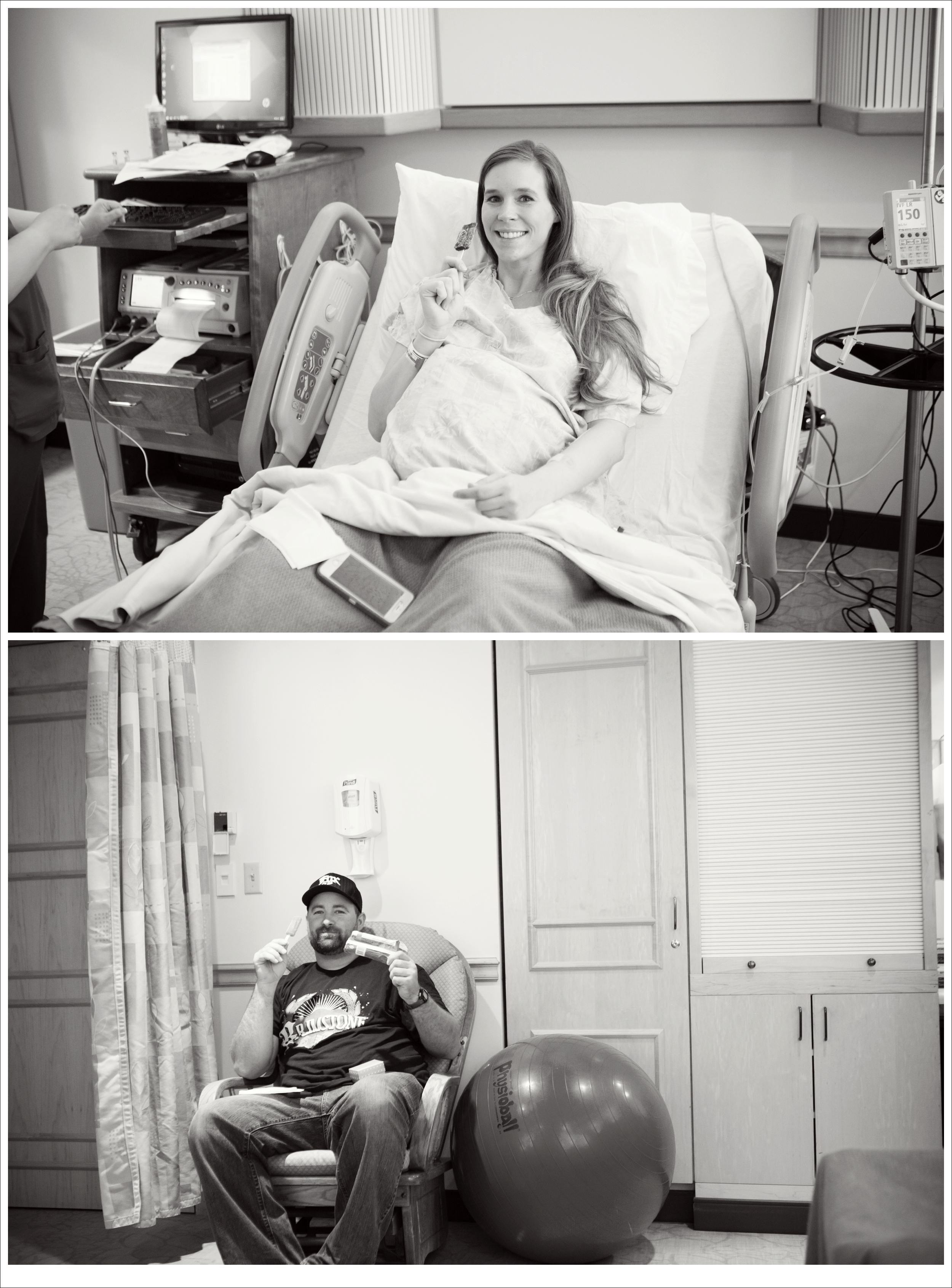 Admittedly, my nerves started around the same time. ‘Will I be able to do this? Well, there’s no turning back now. Would I be able to have this baby without pain medication also? Could I take it? Will my baby be healthy?’ My mind started silently racing with a million questions just as my grandma came in with my great-auntie. We were all gabbing in the room, laughing and eagerly awaiting things to start progressing. Every few minutes, someone would say are you feeling anything?” and my answer was ‘not really’. This was a great distraction for me as I continued to roll around on the birthing ball and try to ignore the giant mess my broken water was making below me. Trust me, there’s nothing quite like having a conversation with your grandma across the room and feeling fluid leaking out of you with each contraction. My nurse, Belinda, came in to check on me periodically and increase my pitocin. Around noon, I told her I’d like to try to use the restroom and that I was finally starting to feel the contractions. She unhooked my monitors and accompanied me to the restroom. I sat, much like my two-year-old daughter, on the toilet and waited to pee. And waited. And Belinda ran water and looked away and really tried everything to help me, but nothing was happening. Then, we both laughed. You see, Belinda and I were in this same bathroom almost 2.5 years ago having this same conversation. I had to pee and couldn’t and then my contractions got real in that bathroom. So real, that my first labor I ended up throwing up. This time, I didn’t feel nauseous, but I was certainly feeling like I was in labor. I told her, apparently this bathroom was my labor starting place. She wanted to check me to see if I had dilated any further.